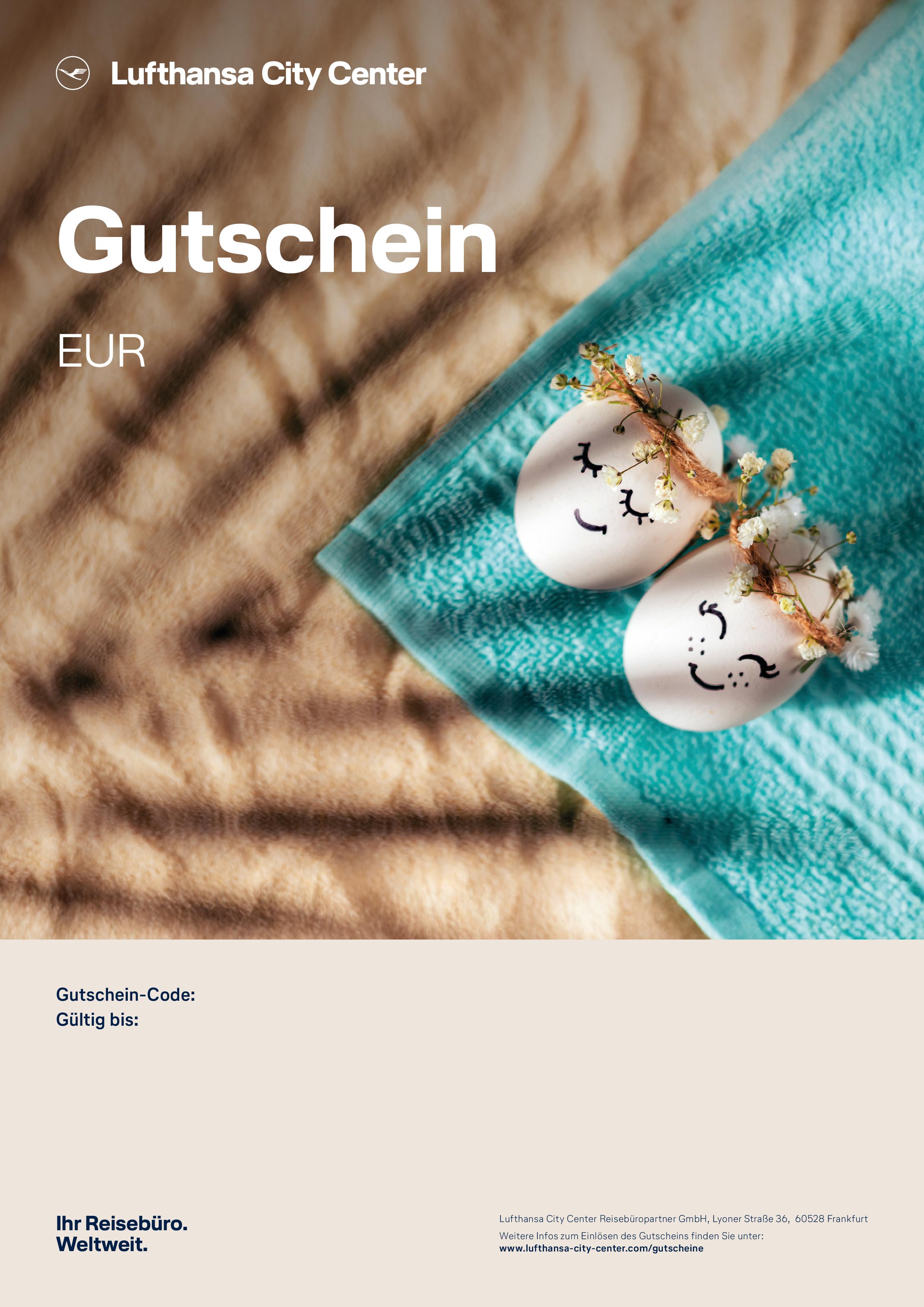 Unser LCC Reisegutschein kann ausschließlich in allen teilnehmenden Lufthansa City Center Reisebüros bei einer Reisebuchung eingelöst werden. Verschenken Sie mit LCC eine Portion Vorfreude auf den nächsten Urlaub!