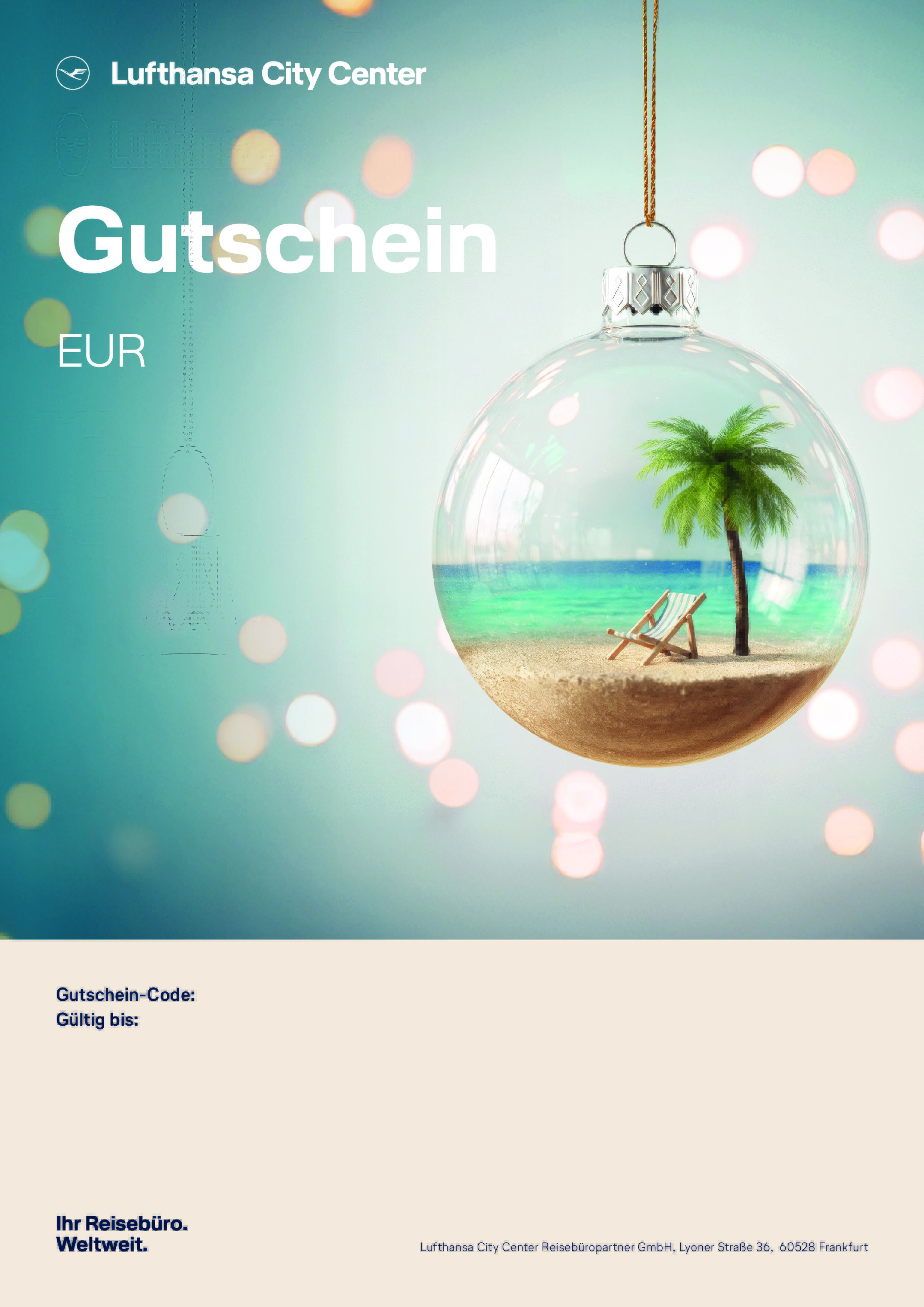 Unser LCC Reisegutschein kann ausschließlich in allen teilnehmenden Lufthansa City Center Reisebüros bei einer Reisebuchung eingelöst werden. Verschenken Sie mit LCC eine Portion Vorfreude auf den nächsten Urlaub!